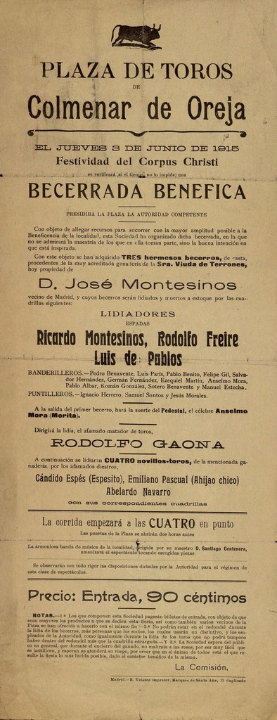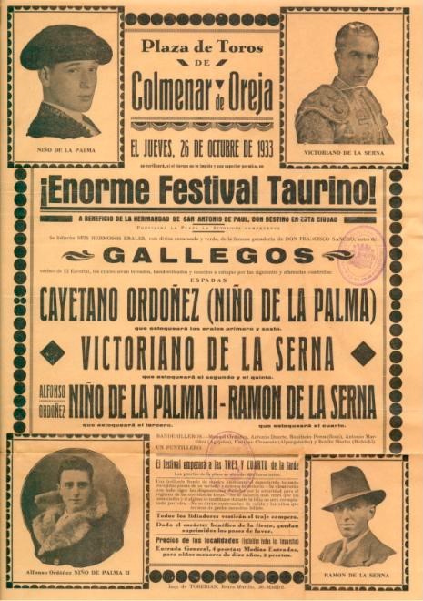 "Cinco hermosos erales, con divisa blanca y encarnada, de la famosa y acreditada ganadería de Don Gabriel G. Sánchez Zaballos de Madrid, los que serán toreados ... por los famosos diestros Cayetano Ordóñez (Niño de La Palma), Juan de La Palma, Antonio Ordóñez, Pepe Ordóñez máximos triunfadores de la actual temporada y Alfonso Ordóñez que por primera vez hace su presentación al público ...